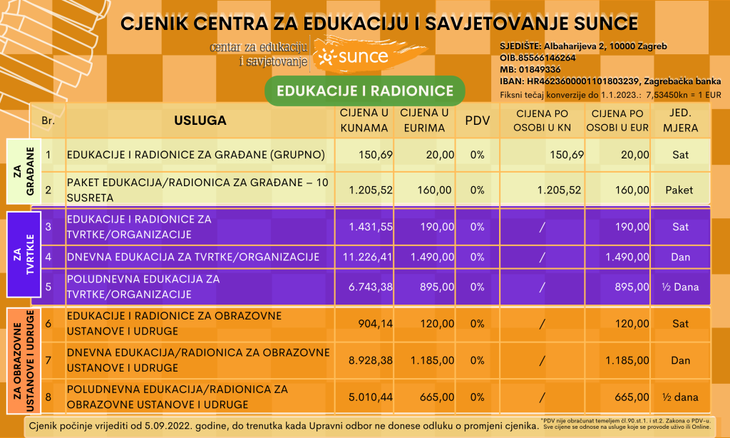 CJENIK CENTRA ZA EDUKACIJU I SAVJETOVANJE SUNCE